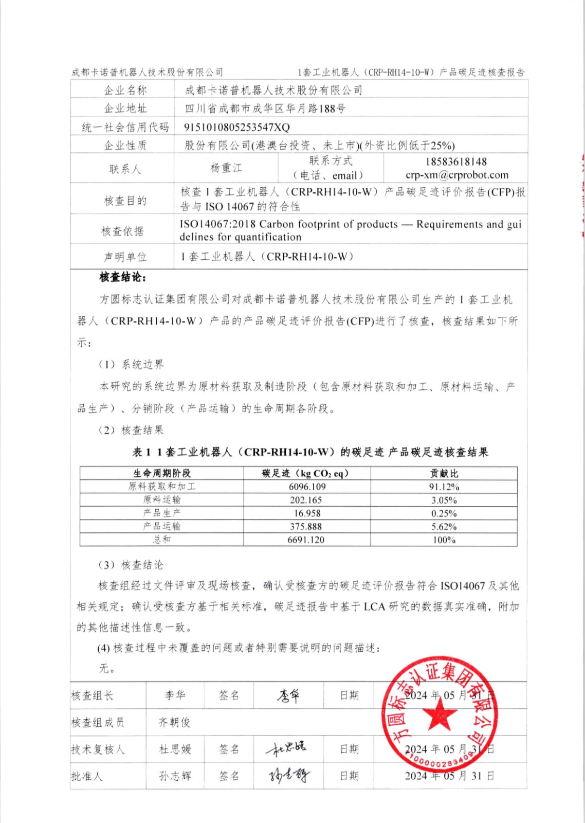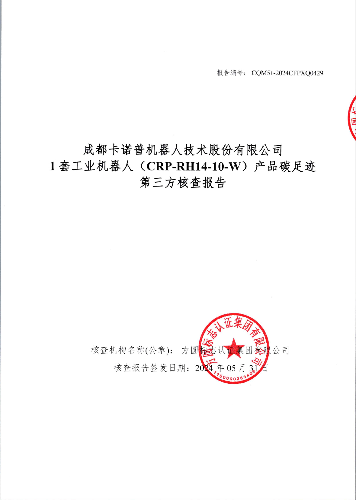 成都28圈電競機器人技術股份有限公司1套工業機器人(CRP-RH14-10-W)產品碳足跡第三方核查報告