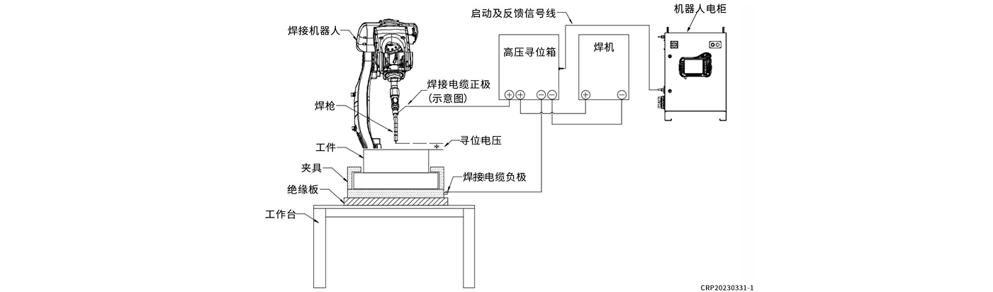 本設備配合焊接機器人的焊絲尋位功能,反饋焊絲在碰到工件的信號,機器人自動計算位置的偏差,修正位置點,使機器人尋到實際的焊接點。